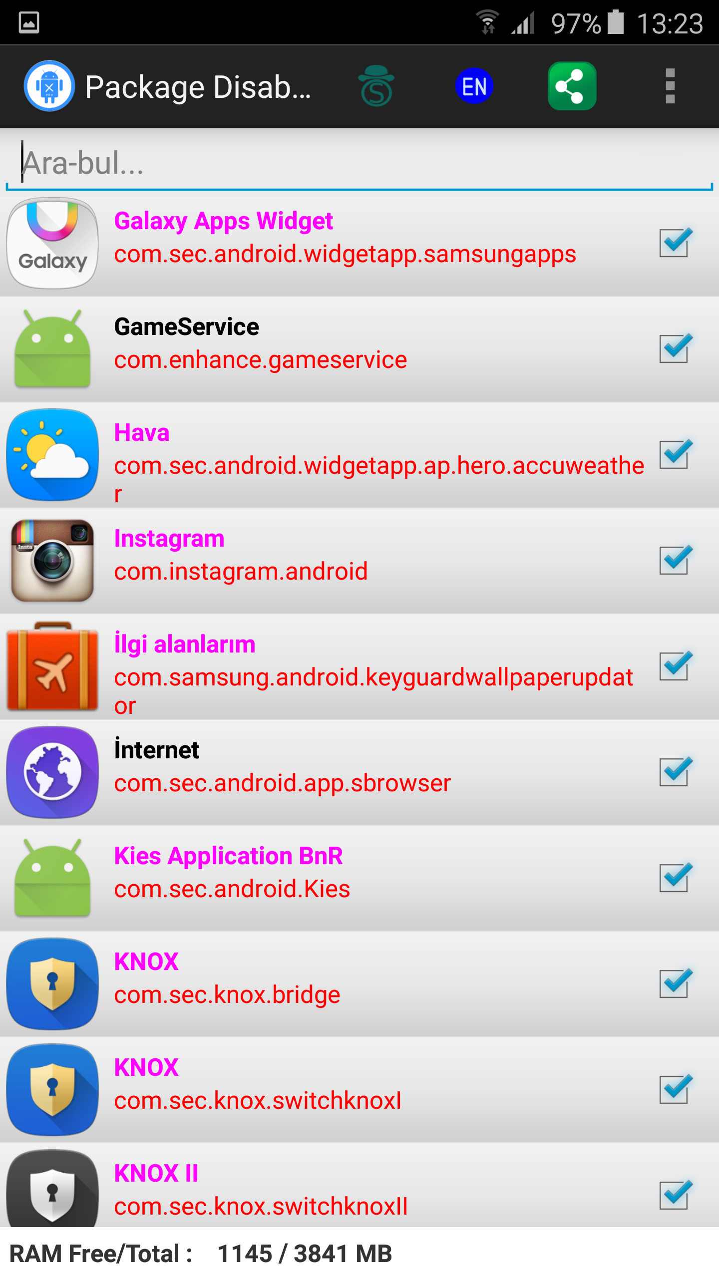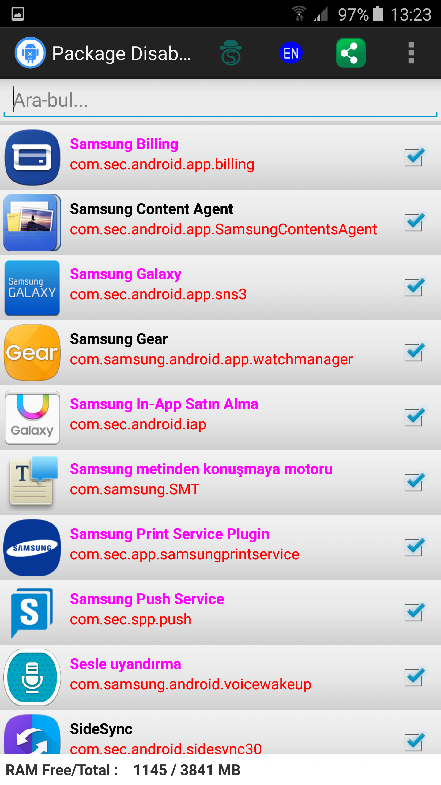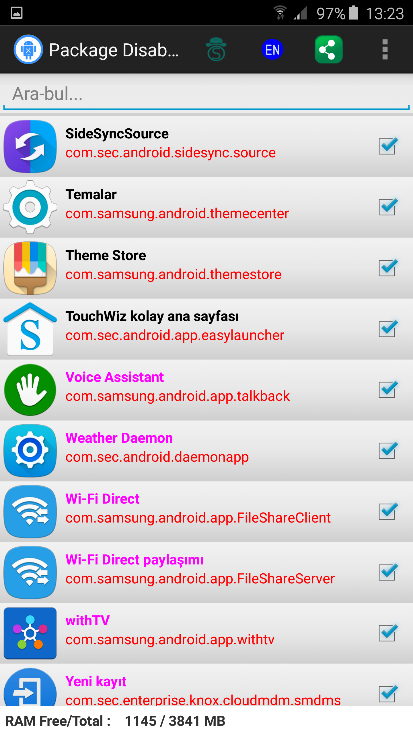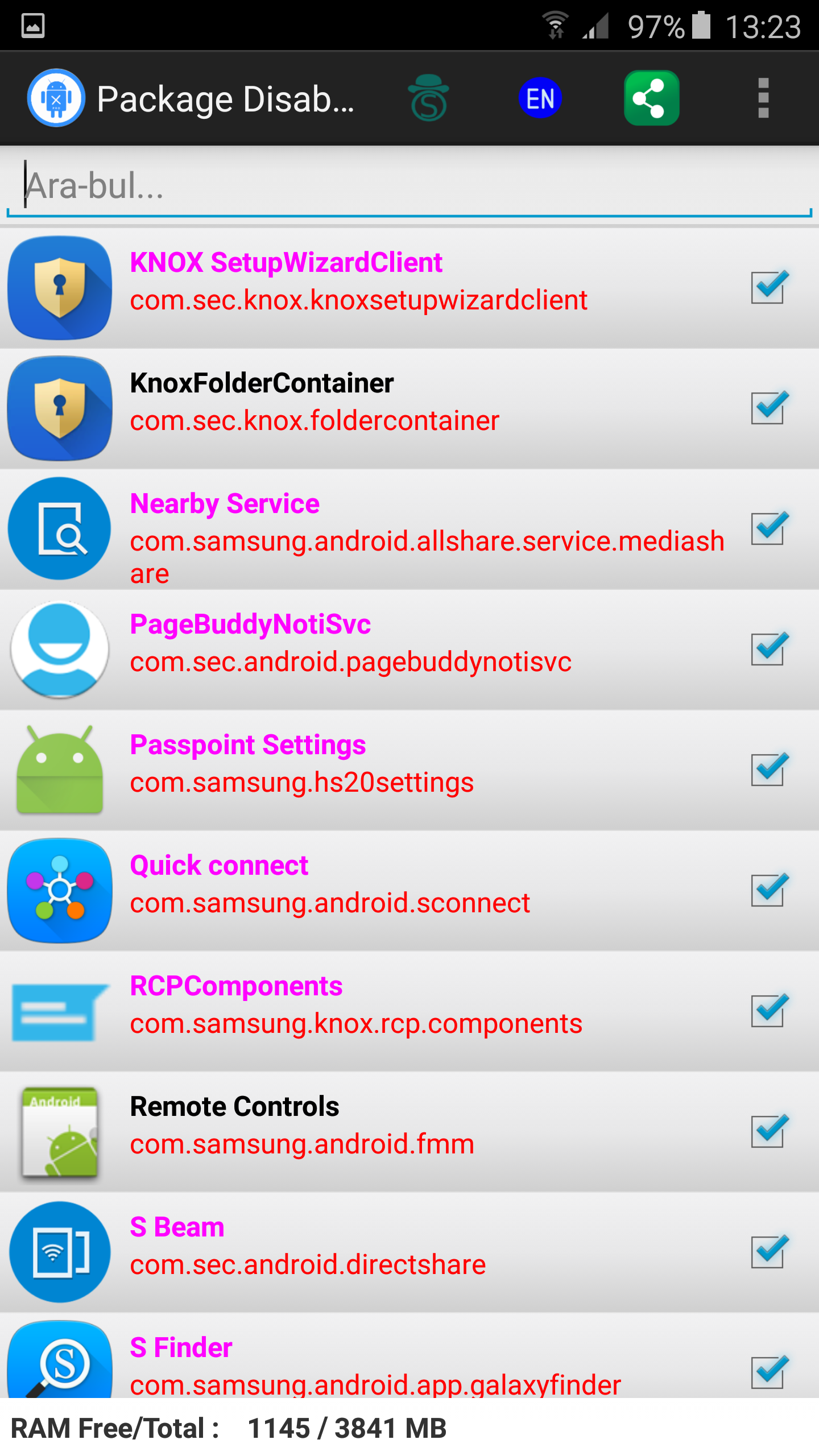 Uygulama yalnızca Samsung cihazlarda çalışmaktadır ve devre dışı bırakacağınız uygulamalara dikkat etmekte fayda var zira sistem uygulamalarını devre dışı bırakırsanız telefonunuzun bazı özellikleri çalışmayabilir. Tabi böyle bir durumda yine aynı programın menüsünden Devre Dışı Olanları Aktif Et tıklayarak normale döndürebilirsiniz.